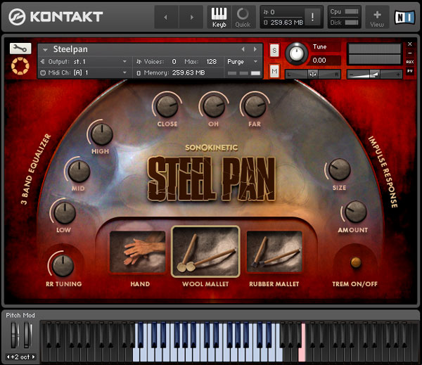 Sonokinetic SteelPan это библиотека сэмплов стального барабана, который популяризировали люди с островов Тринидад и Тобаго. Тропическая радость излучается от каждого прикосновения к этому прекрасному инструменту. Инструмент записан с использованием двух различных типов палочек и дополнительно с помощью пальцев. SteelPan записан с использованием 5 микрофонов, что дает вам возможность смешивать звук как вам нравится.