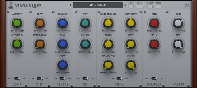 Vinyl Strip это мульти-эффект с 6 модулями: дисторшн, компрессор, бит-крашер, эквалайзер, ревербератор и винилайзер. Модули могут перестраиваться в любую комбинацию простым перетаскиванием. Vinyl Strip добавит жизнь и олдскульный штрих в ваши треки, и поможет достичь звука классических виниловых записей.