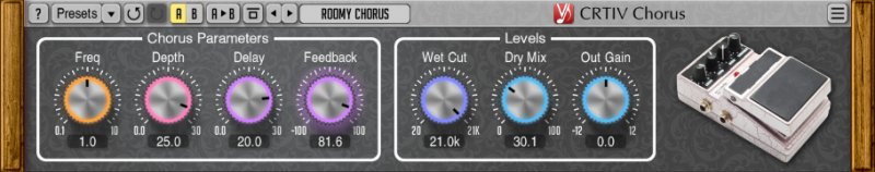 CRTIV Chorus это эффект хоруса, который способен создавать расширяющие стерео и странные модуляционные эффекты. Плагин использует 4 оператора для каждого канала, что позволяет создавать достаточно плотный звук стерео хоруса.