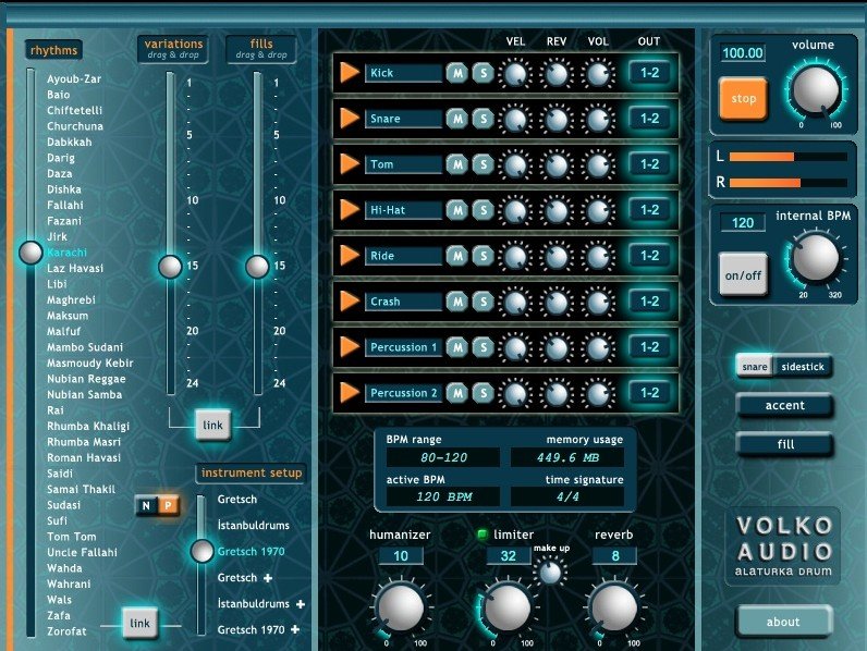 Volko Alaturka Drum - драм-сэмплер с ритмами Ближнего Востока, Северной Африки, Аравии и Анатолии. Просто выбираете нужный ритм и нажимаете кнопку "play".