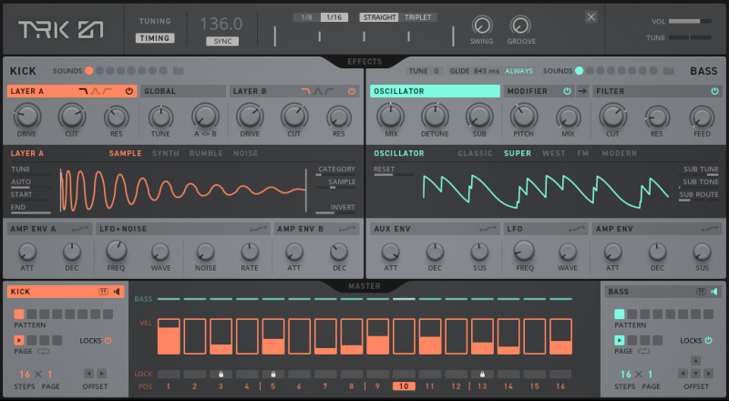 Низкие частоты формируют фундамент почти всей электронной музыки, так что, создание отличной бочки и баса на старте имеет важное значение. TRK-01 соединяет классические методы сведения с инновационным саунд-дизайном, работой с секвенциями и модуляцией, поэтому вы будете всегда вдохновлены при написании плотной и захватывающей комбинации бочки-баса. Делайте качающие и массивные треки быстрее чем прежде с TRK-01. Инструмент состоит из модуля для создания бочки KICK, модуля баса BASS с несколькими движками синтеза, пошагового секвенсора и секции эффектов для дальнейшего формирования звука.