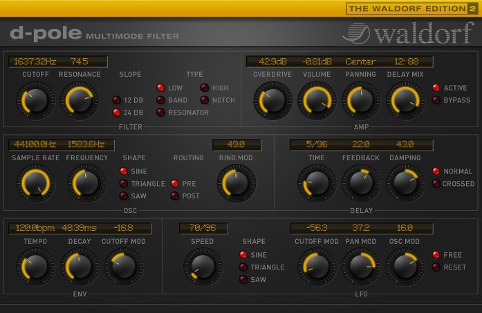 D-Pole - универсальный фильтр, который предлагает мощные возможности аппаратных устройств. Плагин имеет 5 типов фильтров, LFO синхронизируемое к темпу, секцию овердрайва, кольцевую модуляцию, стерео задержку и возможность снижения частоты дискретизации.