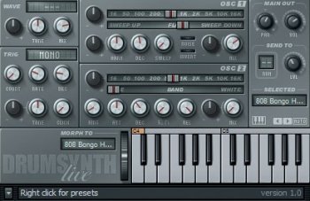 DrumSynth Live - обновленная версия популярного DrumSynth, созданного Maxim Digital Audio. DrumSynth Live обладает одновременной поддержкой 24 программируемых патчей ударных, назначенных на разные клавиши ( от C4 до B5). Вы можете динамически превращать один патч в другой - просто выбрав патч для морфинга и настроить значения колеса морфинга. Звук создается посредством двух шумовых генераторов и с помощью bandpass фильтров - вы можете установить все что угодно от одиночной частоты (sine wave) до белого шума.