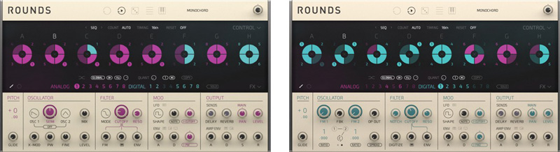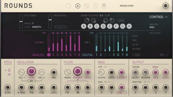 Аналоговый движок вдохновлен классическим, двух осцилляторным синтезатором, и имеет теплый и гармонически насыщенный звук. Цифровая сторона ROUNDS это FM-движок с тремя осцилляторами и 2-полюсным фильтром. Получайте целый спектр звуков, от искрящихся и чистых до металлических и диссонирующих.